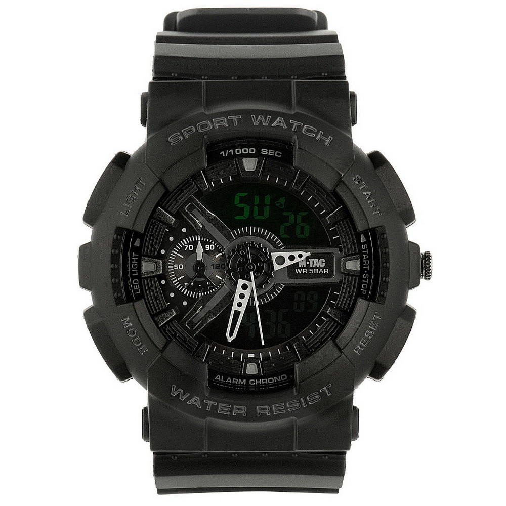 Стильний годинник Sport від українського бренду M-Tac додасть солідності будь-якого образу. Корпус і скло виконані з міцного полікарбонату і легко витримують незначні удари і падіння. Діаметр годинника - 4.6 см, а товщина - 1.4 см. Чорний силіконовий ремінець зі сталевою пряжкою добре виглядає на руці. Його максимальна довжина - 22 см. Це багатофункціональна модель, яка не боїться попадання вологи, показує час у форматі 12/24 на сучасному LCD дисплеї, має секундомір, будильник, автоматичний календар і підсвічування, що буде вельми до речі в темний час доби. Всі налаштування здійснюються за допомогою кнопок, розташованих на корпусі. Електронний механізм забезпечує точність ходу. Даний аксесуар відмінно підійде любителям активного відпочинку та спортивного стилю. Колір годинника - чорний