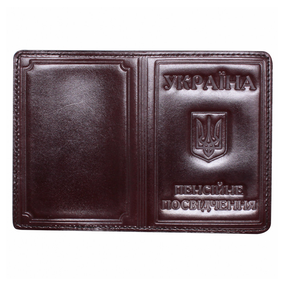 Обкладинка на пенсійне посвідчення підходить для посвідчення-книжки, зроблена під розмір українського стандарту. Вона оберігає документи від стирання, вицвітання, впливу вологи. Матеріал обкладинки — натуральна шкіра, за контуром вона прошита міцними нитками. Усередині є кріплення для документа. Ліва внутрішня частина має прозоре віконце. Снаружи есть надпись "Україна Пенсійне посвідчення" и трезубец. Колір обкладинки — коричневий.